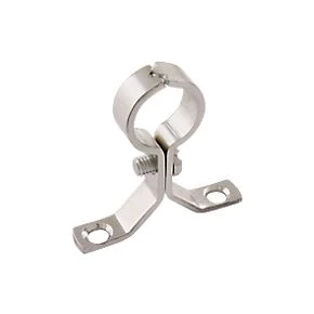 Pressed chrome-plated saddle clips for mounting and retaining pipe or tubing.