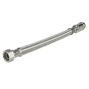 Lightweight, silver braided flexible hose with service valve. Easy to use in tight spaces. Removable and reusable without tools.